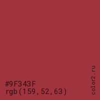 Цвет #9F343F в цветовой модели RGB обозначается тремя октетами (159, 52, 63) в десятичном формате и #9F343F в шестнадцатиричном (hex) формате, которые являются интенсивностью красного 159 (hex 9F), интенсивность зелёного 52 (hex 34) и интенсивность синего 63 (hex 3F).