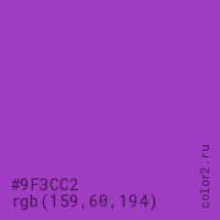 Цвет #9F3CC2 в цветовой модели RGB обозначается тремя октетами (159, 60, 194) в десятичном формате и #9F3CC2 в шестнадцатиричном (hex) формате, которые являются интенсивностью красного 159 (hex 9F), интенсивность зелёного 60 (hex 3C) и интенсивность синего 194 (hex C2).