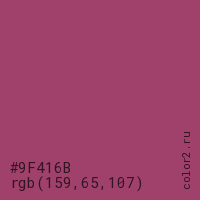 Цвет #9F416B в цветовой модели RGB обозначается тремя октетами (159, 65, 107) в десятичном формате и #9F416B в шестнадцатиричном (hex) формате, которые являются интенсивностью красного 159 (hex 9F), интенсивность зелёного 65 (hex 41) и интенсивность синего 107 (hex 6B).