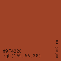 Цвет #9F4226 в цветовой модели RGB обозначается тремя октетами (159, 66, 38) в десятичном формате и #9F4226 в шестнадцатиричном (hex) формате, которые являются интенсивностью красного 159 (hex 9F), интенсивность зелёного 66 (hex 42) и интенсивность синего 38 (hex 26).