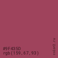 Цвет #9F435D в цветовой модели RGB обозначается тремя октетами (159, 67, 93) в десятичном формате и #9F435D в шестнадцатиричном (hex) формате, которые являются интенсивностью красного 159 (hex 9F), интенсивность зелёного 67 (hex 43) и интенсивность синего 93 (hex 5D).