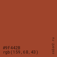 Цвет #9F442B в цветовой модели RGB обозначается тремя октетами (159, 68, 43) в десятичном формате и #9F442B в шестнадцатиричном (hex) формате, которые являются интенсивностью красного 159 (hex 9F), интенсивность зелёного 68 (hex 44) и интенсивность синего 43 (hex 2B).
