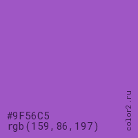 Цвет #9F56C5 в цветовой модели RGB обозначается тремя октетами (159, 86, 197) в десятичном формате и #9F56C5 в шестнадцатиричном (hex) формате, которые являются интенсивностью красного 159 (hex 9F), интенсивность зелёного 86 (hex 56) и интенсивность синего 197 (hex C5).