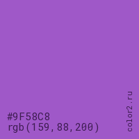 Цвет #9F58C8 в цветовой модели RGB обозначается тремя октетами (159, 88, 200) в десятичном формате и #9F58C8 в шестнадцатиричном (hex) формате, которые являются интенсивностью красного 159 (hex 9F), интенсивность зелёного 88 (hex 58) и интенсивность синего 200 (hex C8).