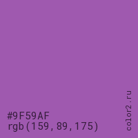 Цвет #9F59AF в цветовой модели RGB обозначается тремя октетами (159, 89, 175) в десятичном формате и #9F59AF в шестнадцатиричном (hex) формате, которые являются интенсивностью красного 159 (hex 9F), интенсивность зелёного 89 (hex 59) и интенсивность синего 175 (hex AF).