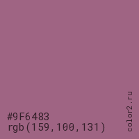 Цвет #9F6483 в цветовой модели RGB обозначается тремя октетами (159, 100, 131) в десятичном формате и #9F6483 в шестнадцатиричном (hex) формате, которые являются интенсивностью красного 159 (hex 9F), интенсивность зелёного 100 (hex 64) и интенсивность синего 131 (hex 83).