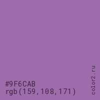 Цвет #9F6CAB в цветовой модели RGB обозначается тремя октетами (159, 108, 171) в десятичном формате и #9F6CAB в шестнадцатиричном (hex) формате, которые являются интенсивностью красного 159 (hex 9F), интенсивность зелёного 108 (hex 6C) и интенсивность синего 171 (hex AB).