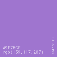 Цвет #9F75CF в цветовой модели RGB обозначается тремя октетами (159, 117, 207) в десятичном формате и #9F75CF в шестнадцатиричном (hex) формате, которые являются интенсивностью красного 159 (hex 9F), интенсивность зелёного 117 (hex 75) и интенсивность синего 207 (hex CF).