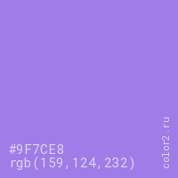Цвет #9F7CE8 в цветовой модели RGB обозначается тремя октетами (159, 124, 232) в десятичном формате и #9F7CE8 в шестнадцатиричном (hex) формате, которые являются интенсивностью красного 159 (hex 9F), интенсивность зелёного 124 (hex 7C) и интенсивность синего 232 (hex E8).