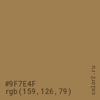Цвет #9F7E4F в цветовой модели RGB обозначается тремя октетами (159, 126, 79) в десятичном формате и #9F7E4F в шестнадцатиричном (hex) формате, которые являются интенсивностью красного 159 (hex 9F), интенсивность зелёного 126 (hex 7E) и интенсивность синего 79 (hex 4F).