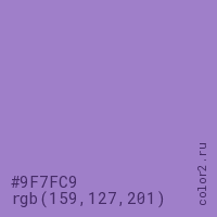 Цвет #9F7FC9 в цветовой модели RGB обозначается тремя октетами (159, 127, 201) в десятичном формате и #9F7FC9 в шестнадцатиричном (hex) формате, которые являются интенсивностью красного 159 (hex 9F), интенсивность зелёного 127 (hex 7F) и интенсивность синего 201 (hex C9).