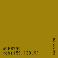 Цвет #9F8209 в цветовой модели RGB обозначается тремя октетами (159, 130, 9) в десятичном формате и #9F8209 в шестнадцатиричном (hex) формате, которые являются интенсивностью красного 159 (hex 9F), интенсивность зелёного 130 (hex 82) и интенсивность синего 9 (hex 09).
