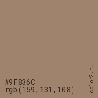 Цвет #9F836C в цветовой модели RGB обозначается тремя октетами (159, 131, 108) в десятичном формате и #9F836C в шестнадцатиричном (hex) формате, которые являются интенсивностью красного 159 (hex 9F), интенсивность зелёного 131 (hex 83) и интенсивность синего 108 (hex 6C).