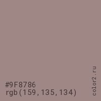 Цвет #9F8786 в цветовой модели RGB обозначается тремя октетами (159, 135, 134) в десятичном формате и #9F8786 в шестнадцатиричном (hex) формате, которые являются интенсивностью красного 159 (hex 9F), интенсивность зелёного 135 (hex 87) и интенсивность синего 134 (hex 86).