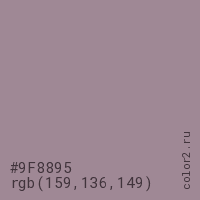 Цвет #9F8895 в цветовой модели RGB обозначается тремя октетами (159, 136, 149) в десятичном формате и #9F8895 в шестнадцатиричном (hex) формате, которые являются интенсивностью красного 159 (hex 9F), интенсивность зелёного 136 (hex 88) и интенсивность синего 149 (hex 95).