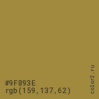 Цвет #9F893E в цветовой модели RGB обозначается тремя октетами (159, 137, 62) в десятичном формате и #9F893E в шестнадцатиричном (hex) формате, которые являются интенсивностью красного 159 (hex 9F), интенсивность зелёного 137 (hex 89) и интенсивность синего 62 (hex 3E).
