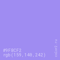 Цвет #9F8CF2 в цветовой модели RGB обозначается тремя октетами (159, 140, 242) в десятичном формате и #9F8CF2 в шестнадцатиричном (hex) формате, которые являются интенсивностью красного 159 (hex 9F), интенсивность зелёного 140 (hex 8C) и интенсивность синего 242 (hex F2).
