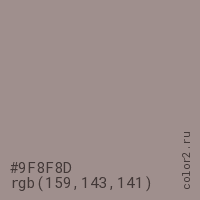 Цвет #9F8F8D в цветовой модели RGB обозначается тремя октетами (159, 143, 141) в десятичном формате и #9F8F8D в шестнадцатиричном (hex) формате, которые являются интенсивностью красного 159 (hex 9F), интенсивность зелёного 143 (hex 8F) и интенсивность синего 141 (hex 8D).