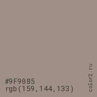 Цвет #9F9085 в цветовой модели RGB обозначается тремя октетами (159, 144, 133) в десятичном формате и #9F9085 в шестнадцатиричном (hex) формате, которые являются интенсивностью красного 159 (hex 9F), интенсивность зелёного 144 (hex 90) и интенсивность синего 133 (hex 85).