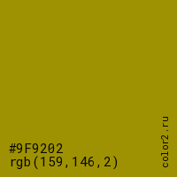 Цвет #9F9202 в цветовой модели RGB обозначается тремя октетами (159, 146, 2) в десятичном формате и #9F9202 в шестнадцатиричном (hex) формате, которые являются интенсивностью красного 159 (hex 9F), интенсивность зелёного 146 (hex 92) и интенсивность синего 2 (hex 02).