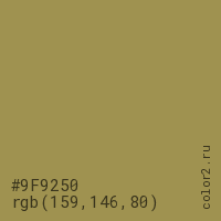 Цвет #9F9250 в цветовой модели RGB обозначается тремя октетами (159, 146, 80) в десятичном формате и #9F9250 в шестнадцатиричном (hex) формате, которые являются интенсивностью красного 159 (hex 9F), интенсивность зелёного 146 (hex 92) и интенсивность синего 80 (hex 50).