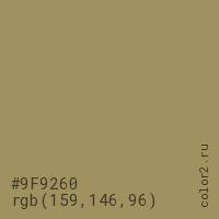 Цвет #9F9260 в цветовой модели RGB обозначается тремя октетами (159, 146, 96) в десятичном формате и #9F9260 в шестнадцатиричном (hex) формате, которые являются интенсивностью красного 159 (hex 9F), интенсивность зелёного 146 (hex 92) и интенсивность синего 96 (hex 60).