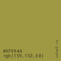 Цвет #9F9944 в цветовой модели RGB обозначается тремя октетами (159, 153, 68) в десятичном формате и #9F9944 в шестнадцатиричном (hex) формате, которые являются интенсивностью красного 159 (hex 9F), интенсивность зелёного 153 (hex 99) и интенсивность синего 68 (hex 44).
