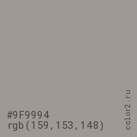 Цвет #9F9994 в цветовой модели RGB обозначается тремя октетами (159, 153, 148) в десятичном формате и #9F9994 в шестнадцатиричном (hex) формате, которые являются интенсивностью красного 159 (hex 9F), интенсивность зелёного 153 (hex 99) и интенсивность синего 148 (hex 94).