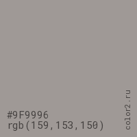 Цвет #9F9996 в цветовой модели RGB обозначается тремя октетами (159, 153, 150) в десятичном формате и #9F9996 в шестнадцатиричном (hex) формате, которые являются интенсивностью красного 159 (hex 9F), интенсивность зелёного 153 (hex 99) и интенсивность синего 150 (hex 96).