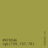Цвет #9F9D46 в цветовой модели RGB обозначается тремя октетами (159, 157, 70) в десятичном формате и #9F9D46 в шестнадцатиричном (hex) формате, которые являются интенсивностью красного 159 (hex 9F), интенсивность зелёного 157 (hex 9D) и интенсивность синего 70 (hex 46).