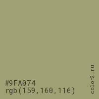 Цвет #9FA074 в цветовой модели RGB обозначается тремя октетами (159, 160, 116) в десятичном формате и #9FA074 в шестнадцатиричном (hex) формате, которые являются интенсивностью красного 159 (hex 9F), интенсивность зелёного 160 (hex A0) и интенсивность синего 116 (hex 74).