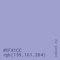 Цвет #9FA1CC в цветовой модели RGB обозначается тремя октетами (159, 161, 204) в десятичном формате и #9FA1CC в шестнадцатиричном (hex) формате, которые являются интенсивностью красного 159 (hex 9F), интенсивность зелёного 161 (hex A1) и интенсивность синего 204 (hex CC).