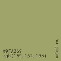 Цвет #9FA269 в цветовой модели RGB обозначается тремя октетами (159, 162, 105) в десятичном формате и #9FA269 в шестнадцатиричном (hex) формате, которые являются интенсивностью красного 159 (hex 9F), интенсивность зелёного 162 (hex A2) и интенсивность синего 105 (hex 69).