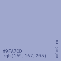 Цвет #9FA7CD в цветовой модели RGB обозначается тремя октетами (159, 167, 205) в десятичном формате и #9FA7CD в шестнадцатиричном (hex) формате, которые являются интенсивностью красного 159 (hex 9F), интенсивность зелёного 167 (hex A7) и интенсивность синего 205 (hex CD).