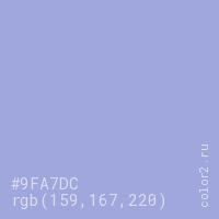 Цвет #9FA7DC в цветовой модели RGB обозначается тремя октетами (159, 167, 220) в десятичном формате и #9FA7DC в шестнадцатиричном (hex) формате, которые являются интенсивностью красного 159 (hex 9F), интенсивность зелёного 167 (hex A7) и интенсивность синего 220 (hex DC).