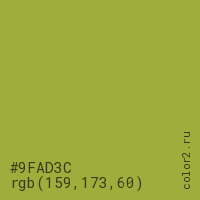 Цвет #9FAD3C в цветовой модели RGB обозначается тремя октетами (159, 173, 60) в десятичном формате и #9FAD3C в шестнадцатиричном (hex) формате, которые являются интенсивностью красного 159 (hex 9F), интенсивность зелёного 173 (hex AD) и интенсивность синего 60 (hex 3C).