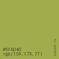 Цвет #9FAD4D в цветовой модели RGB обозначается тремя октетами (159, 173, 77) в десятичном формате и #9FAD4D в шестнадцатиричном (hex) формате, которые являются интенсивностью красного 159 (hex 9F), интенсивность зелёного 173 (hex AD) и интенсивность синего 77 (hex 4D).