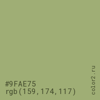 Цвет #9FAE75 в цветовой модели RGB обозначается тремя октетами (159, 174, 117) в десятичном формате и #9FAE75 в шестнадцатиричном (hex) формате, которые являются интенсивностью красного 159 (hex 9F), интенсивность зелёного 174 (hex AE) и интенсивность синего 117 (hex 75).