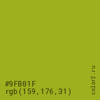 Цвет #9FB01F в цветовой модели RGB обозначается тремя октетами (159, 176, 31) в десятичном формате и #9FB01F в шестнадцатиричном (hex) формате, которые являются интенсивностью красного 159 (hex 9F), интенсивность зелёного 176 (hex B0) и интенсивность синего 31 (hex 1F).