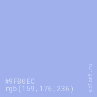 Цвет #9FB0EC в цветовой модели RGB обозначается тремя октетами (159, 176, 236) в десятичном формате и #9FB0EC в шестнадцатиричном (hex) формате, которые являются интенсивностью красного 159 (hex 9F), интенсивность зелёного 176 (hex B0) и интенсивность синего 236 (hex EC).