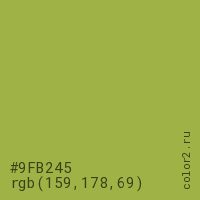 Цвет #9FB245 в цветовой модели RGB обозначается тремя октетами (159, 178, 69) в десятичном формате и #9FB245 в шестнадцатиричном (hex) формате, которые являются интенсивностью красного 159 (hex 9F), интенсивность зелёного 178 (hex B2) и интенсивность синего 69 (hex 45).