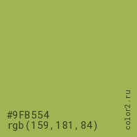 Цвет #9FB554 в цветовой модели RGB обозначается тремя октетами (159, 181, 84) в десятичном формате и #9FB554 в шестнадцатиричном (hex) формате, которые являются интенсивностью красного 159 (hex 9F), интенсивность зелёного 181 (hex B5) и интенсивность синего 84 (hex 54).