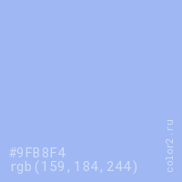 Цвет #9FB8F4 в цветовой модели RGB обозначается тремя октетами (159, 184, 244) в десятичном формате и #9FB8F4 в шестнадцатиричном (hex) формате, которые являются интенсивностью красного 159 (hex 9F), интенсивность зелёного 184 (hex B8) и интенсивность синего 244 (hex F4).