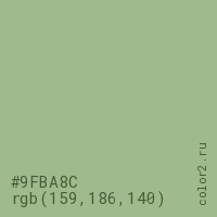 Цвет #9FBA8C в цветовой модели RGB обозначается тремя октетами (159, 186, 140) в десятичном формате и #9FBA8C в шестнадцатиричном (hex) формате, которые являются интенсивностью красного 159 (hex 9F), интенсивность зелёного 186 (hex BA) и интенсивность синего 140 (hex 8C).