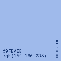 Цвет #9FBAEB в цветовой модели RGB обозначается тремя октетами (159, 186, 235) в десятичном формате и #9FBAEB в шестнадцатиричном (hex) формате, которые являются интенсивностью красного 159 (hex 9F), интенсивность зелёного 186 (hex BA) и интенсивность синего 235 (hex EB).
