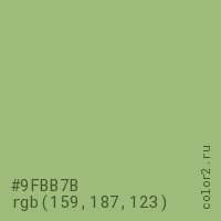 Цвет #9FBB7B в цветовой модели RGB обозначается тремя октетами (159, 187, 123) в десятичном формате и #9FBB7B в шестнадцатиричном (hex) формате, которые являются интенсивностью красного 159 (hex 9F), интенсивность зелёного 187 (hex BB) и интенсивность синего 123 (hex 7B).