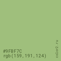 Цвет #9FBF7C в цветовой модели RGB обозначается тремя октетами (159, 191, 124) в десятичном формате и #9FBF7C в шестнадцатиричном (hex) формате, которые являются интенсивностью красного 159 (hex 9F), интенсивность зелёного 191 (hex BF) и интенсивность синего 124 (hex 7C).