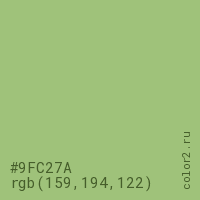 Цвет #9FC27A в цветовой модели RGB обозначается тремя октетами (159, 194, 122) в десятичном формате и #9FC27A в шестнадцатиричном (hex) формате, которые являются интенсивностью красного 159 (hex 9F), интенсивность зелёного 194 (hex C2) и интенсивность синего 122 (hex 7A).