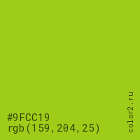 Цвет #9FCC19 в цветовой модели RGB обозначается тремя октетами (159, 204, 25) в десятичном формате и #9FCC19 в шестнадцатиричном (hex) формате, которые являются интенсивностью красного 159 (hex 9F), интенсивность зелёного 204 (hex CC) и интенсивность синего 25 (hex 19).