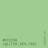 Цвет #9FCC90 в цветовой модели RGB обозначается тремя октетами (159, 204, 144) в десятичном формате и #9FCC90 в шестнадцатиричном (hex) формате, которые являются интенсивностью красного 159 (hex 9F), интенсивность зелёного 204 (hex CC) и интенсивность синего 144 (hex 90).